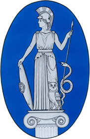 .Геральдическое описание герба: В овальном щите в лазуревом поле богиня Афина, стоящая на возникающей из острия щита капители колонны ионического ордера, смотрящая вправо, облаченная в пеплос и носящая шлем, правой рукой придерживающая эгиду, а в левой - держащая копье с обвивающейся вокруг него змеей, и сопровождаемая у левой ноги смотрящей вперед совой, все серебряное.