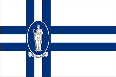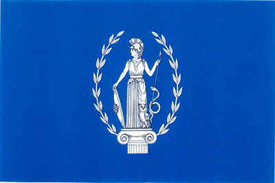Флаг представляет собой прямоугольное синее полотнище (2:3), в середине которого в обрамлении откры того овального венка, составленного из двух оливковых ветвей, изображена богиня Афина, стоящая на возникающей из острия щита капители колонны ионического ордера, смотрящая вправо, облаченная в пеплос и носящая шлем, правой рукой придерживающая эгиду, а в левой - держащая копье с обвивающейся вокруг него змеей, и сопровождаемая у левой ноги смотрящей вперед совой, все белое.