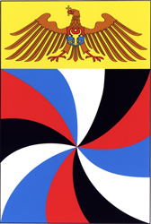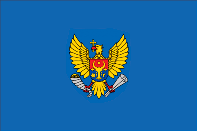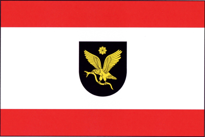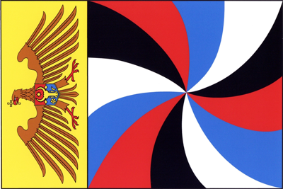 Флаг представляет собой красное прямоугольное полотнище (2:3) с широким белым поясом (3/5 h): в середине которого геральдический щит прямоугольной формы с закругленной оконечностью (2/5 h), обремененный гербом управления (в черном поле орел с раскрытыми крыльями, схвативший клювом и когтями змею, все вправо, желтое и сопровождаемое сверху сияющей восьмилучевой звездой того же цвета).