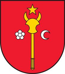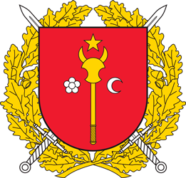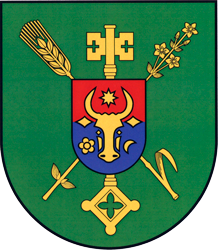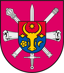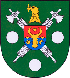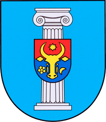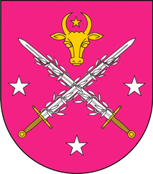 Геральдическое описание герба: В пурпурном поле два серебряных меча с золотыми рукоятями, перекрещенные в косой крест, обвитые каждый серебряной оливковой ветвью и сопровождаемые в верхнем кантоне золотой головой тура с пятилучевой звездой того же металла между рогами, а в остальных кантонах – серебряными пятиконечными звездами.