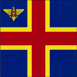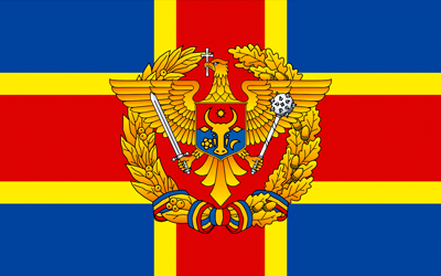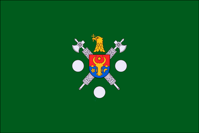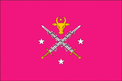 Флаг представляет собой прямоугольное пурпурное полотнище (2:3), в середине которого два белых меча с желтыми рукоятями, перекрещенные в косой крест, обвитые каждый белой оливковой ветвью и сопровождаемые в верхнем кантоне желтой головой тура с пятилучевой звездой того же цвета между рогами, а в остальных кантонах – белыми пятиконечными звездами.