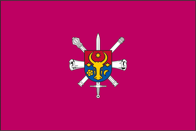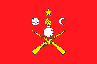 Флаг представляет собой прямоугольное светло-красное полотнище (2:3), в середине которого, над двумя желтыми карабинами, перекрещенными в косой крест дулами кверху, белая, зажженная желтым, военная граната, сопровождаемая сверху желтой пятиконечной звездой, белой геральдической розой и белым же убывающим полумесяцем, в обратном порядке.