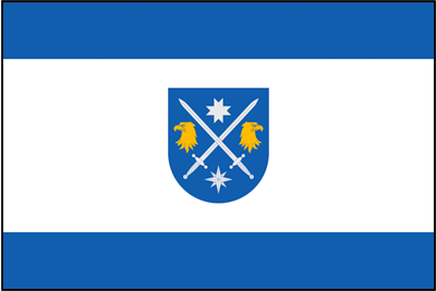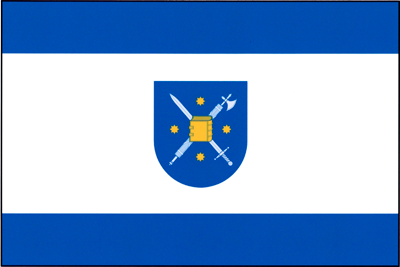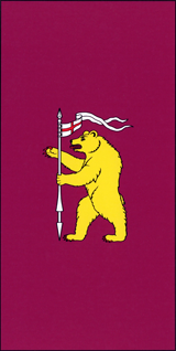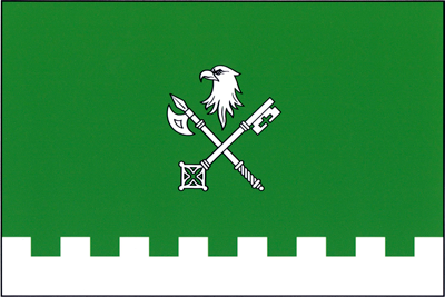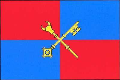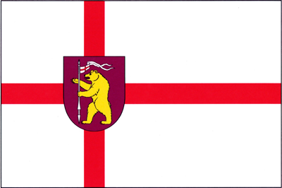 Флаг представляет собой прямоугольное белое полотнище (2:3) с красным узким (1/9 h) скандинавским крестом, на середину которого наложен геральдический щиток прямоугольной формы с закругленной оконечностью (высотой 2/5 h) пурпурного цвета, обремененный желтым восстающим медведем с красными языком и когтями, атакующим передней правой лапой и несущим в левой белое турнирное копье в столб с развевающимся на конце флажком с двумя косицами, белым же и обремененным красным нитяным крестом.