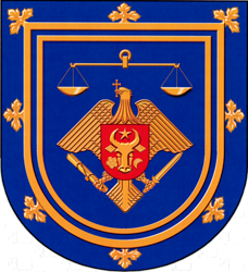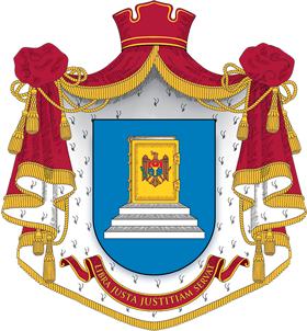 Геральдическое описание герба: В лазуревом поле под золотыми равноплечными балансовыми весами в равновесии - орел с полураскрытыми крыльями того же металла, несущий в клюве крест, в правой лапе запечатанный бумажный свиток, в левой - гладиус, все также золотые, а на груди щите гербом Земли Молдавской: в червленом поле золотая голова тура прямо, сопровождаемая между рогами восьмилучевой звездой, справа - геральдической розой и слева - убывающим полумесяцем, все того же металла.