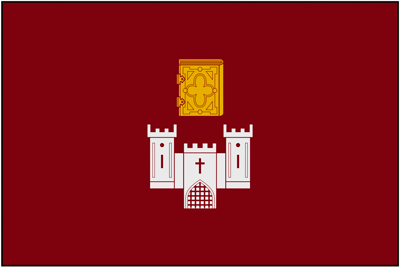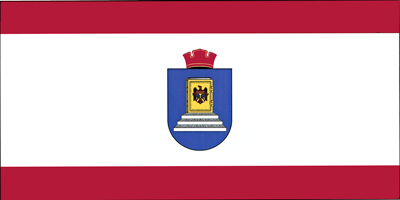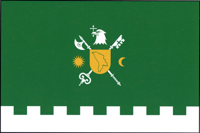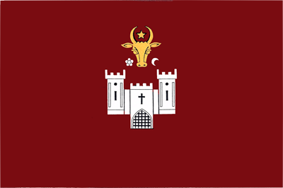 Флаг представляет собой прямоугольное темно-красное полотнище (2:3), в середине которого белая крепость с тремя башнями и закрытыми герсой воротами центральной башни, над которой желтая голова тура прямо, сопровождаемая между рогами пятиконечной звездой того же цвета, внизу справа - белой геральдической розой и слева - белым же убывающим полумесяцем.