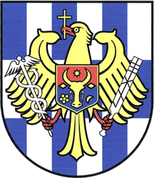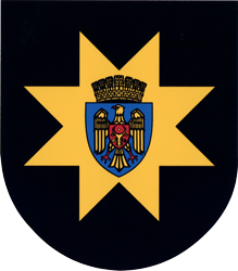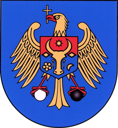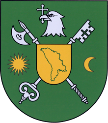 Геральдическое описание герба: Щит разделен двенадцатичастно клинчато-дугообразно влево лазорево-серебряно-черно-червленым чередованием. Во главе щита в золотом поле натуральный орел с широко распростертыми крыльями, с червлеными клювом и лапами, держащий в клюве золотей крест и несущий на груди щит с малым гербом Республики Молдова.