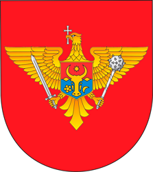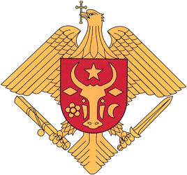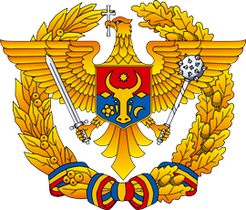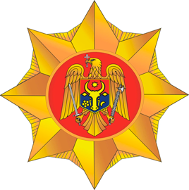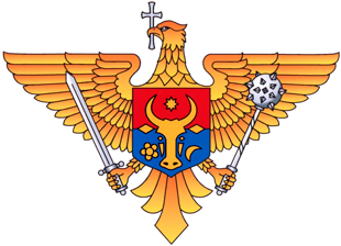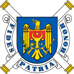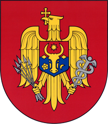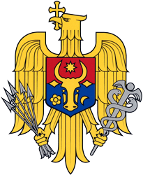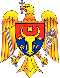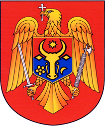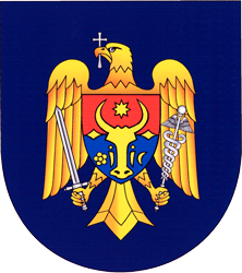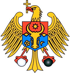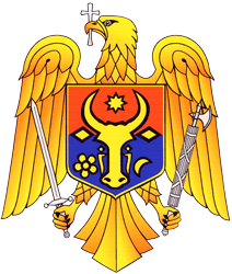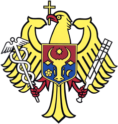 Геральдическое описание герба: В червленом поле золотой орел с опущенными крыльями, несущий в клюве крест того же металла, в правой лапе пять серебряных стрел, в левой – серебряный же Меркуриев жезл, а на груди щит, обремененный малым гербом Республики Молдова (в поле, пересеченном червленью и лазурью, наложенная голова тура прямо, сопровождаемая между рогами восьмилучевой звездой, справа – геральдической розой и слева – убывающим полумесяцем, все золотое).