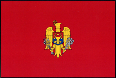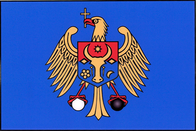 Флаг представляет собой прямоугольное красное полотнище (2:3), в середине которого желтый орел с опущенными крыльями, несущий в клюве крест того же цвета, в правой лапе пять белых стрел, в левой – белый же Меркуриев жезл, а на груди щит, обремененный малым гербом Республики Молдова (в поле, пересеченном красным и синим, наложенная голова тура прямо, сопровождаемая между рогами восьмилучевой звездой, справа – геральдической розой и слева – убывающим полумесяцем, все желтое).