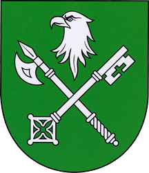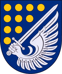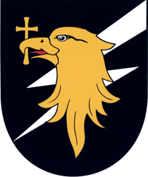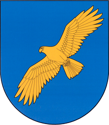 .Геральдическое описание герба: В темно-лазоревом поле серебряное орлиное крыло, обращенное к левому кантону оконечности щита и держащее в руке меч в перевязь слева того же металла, сопровождаемый справа десятью золотыми монетами, упорядоченными к правому кантону главы щита, четыре, три, две и одна.