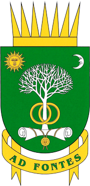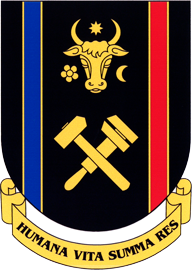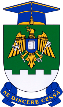 Геральдическое описание герба: В темно-красном поле серебряная крепость с тремя башнями и закрытыми герсой воротами центральной башни, над которой золотая книга. Девиз на темно-красной ленте золотыми прописными буквами: "DOCENDO DISCIMUS" (Обучая – мы учимся).