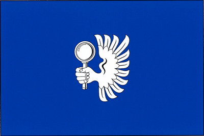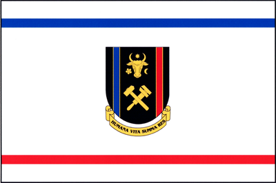 Флаг представляет собой красное прямоугольное полотнище (2:3) с широким белым поясом (3/5 h), в середине которого геральдический щит прямоугольной формы с закругленной оконечностью (2/5 h), обремененный гербом центра (в черном поле желтый пониженный появляющийся лев с красными языком и когтями, держащий в передней правой лапе желтую же лупу, а в левой - зажженную красным желтую военную гранату).