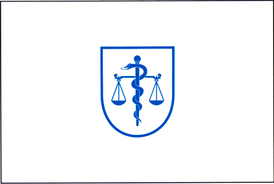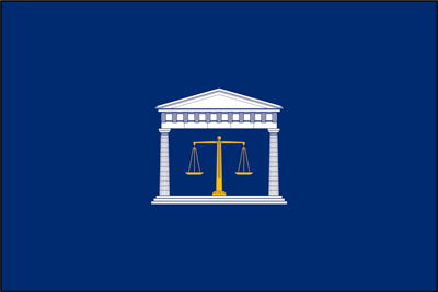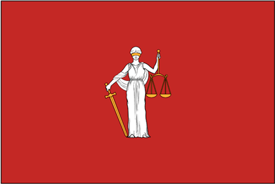Флаг представляет собой прямоугольное бордовое (Pantone 7627 C) полотнище (2:3), в середине которого изображение стоящей в фас богини Фемиды, смотрящей вперед, одетой в длинный хитон, все белое, с желтой повязкой на глазах, держащей в правой руке упирающийся в землю меч, а в левой – балансовые весы в равновесии, обе фигуры также желтые.