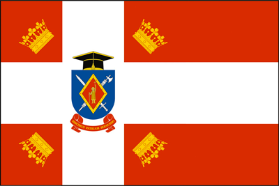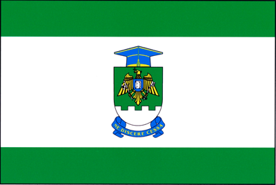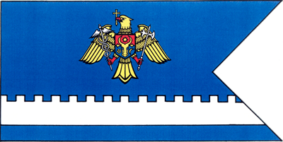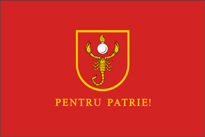 Флаг представляет собой прямоугольное темно-красное полотнище (2:3), в середине которого в желтой внутренней кайме геральдического щита прямоугольной формы с закругленной оконечностью желтый же скорпион, сопровождаемый между педипальпами белой, зажженной желтым, военной гранатой. Под каймой желтыми прописными буквами вписан девиз: "PENTRU PATRIE !".