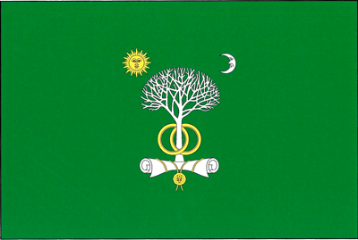 Флаг представляет собой прямоугольное зеленое полотнище (2:3), в середине которого белое молодое обнаженное дерево., произрастающее из белого бумажного свитка в пояс, запечатанного желтыми печатью и шнуром, продетое между двумя соединенными желтыми кольцами в пояс и фланкированное вверху желтым солнцем и белым нарастающим полумесяцем, оба светила с чертами человеческого лица.