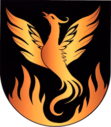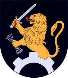 Геральдическое описание герба: В черном поле золотой лев с червлеными языком и когтями, возникающий из серебряной шестеренки, возникающей в свою очередь из острия щита, и держащий в правой передней лапе серебряный же меч в перевязь слева, а в левой – пять стрел того же металла.