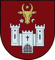 Геральдическое описание герба: В темно-червленом поле серебряная крепость с тремя башнями и закрытыми герсой воротами центральной башни, над которой золотая голова тура прямо, сопровождаемая между рогами пятиконечной звездой того же металла, внизу справа - серебряной геральдической розой и слева - серебряным же убывающим полумесяцем.