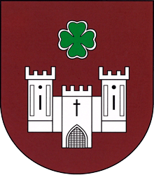 Геральдическое описание герба: В темно-червленом поле серебряная крепость с тремя башнями и закрытыми герсой воротами центральной башни, сопровождаемая сверху зеленым, окаймленным серебром, четырехпластинчатым листом клевера без черенка.