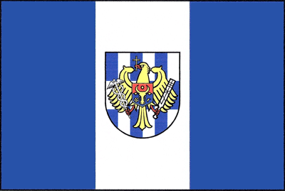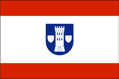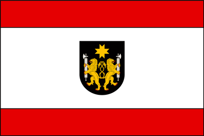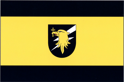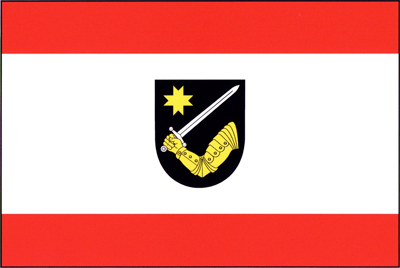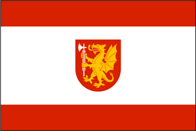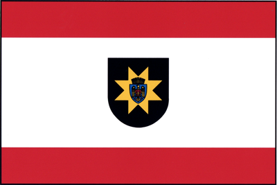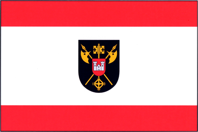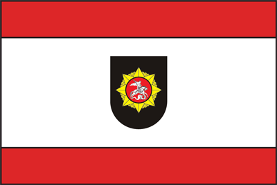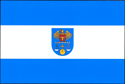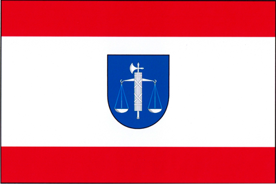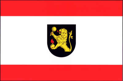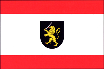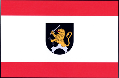 Флаг представляет собой прямоугольное красное полотнище (2:3) с широким белым поясом (3/5 h), в середине которого геральдический щит прямоугольной формы с закругленной оконечностью (2/5 h), обремененный гербом управления (в черном поле желтый сидящий лев с поднятой правой передней лапой и с красными языком и когтями).