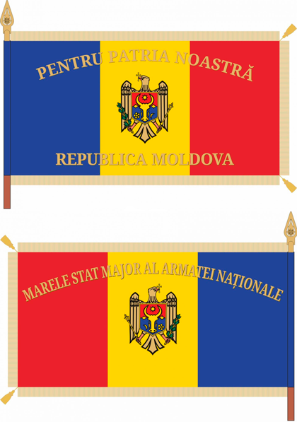 Древко знамени заканчивается наконечником копьевидной формы, изготовленным из бронзы, покрытой латунью, в середине которого помещен Государственный герб Республики Молдова.