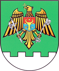 .Геральдическое описание герба:В лазуревом поле серебряный грифон, держащий в правой лапе золотой диске круглым отверстием, а левой - придерживающий наклоненный щит, обремененный малым гербом Республики Молдова.