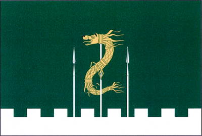 Флаг представляет собой прямоугольное полотнище (2:3) темно-красного цвета, в середине которого стражник в полных желтых доспехах и в шлеме с опущенным забралом, держащий в правой руке поднятый в столб меч того же цвета и стоящий за зубцами на боевом ходу белой крепости с двумя крытыми боковыми башнями и с входными воротами, закрытыми черной герсой..