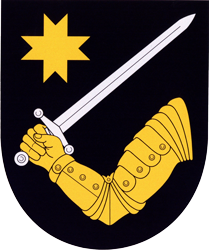 Геральдическое описание герба: В черном поле золотая правая рука в латах, без перчатки, держащая серебряный меч в левую перевязь и сопровождаемая в вольном кантоне щита золотым восьмишпильным крестом.