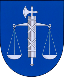 Геральдическое описание герба: В лазуревом поле серебряные равноплечные балансовые весы в равновесии, на которые наложены серебряные же фасции в столб.