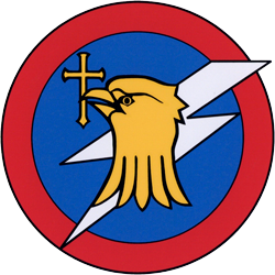Эмблема представляет собой круглый светло-лазуревый геральдический щит с червленой каймой, на который наложена заходящая за края щита серебряная молния в перевязь слева с наложенной поверх нее оторванной золотой головой орла, держащего в клюве золотой же крест.