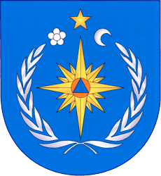 Геральдическое описание герба: В лазуревом поле золотая 16-лучевая роза ветров, несущая в середине международный символ гражданской защиты (лазуревый равносторонний треугольник острием вверх, вписанный в оранжевый круг), окруженная двумя серебряными оливковыми ветвями и сопровождаемая сверху золотой пятилучевой звездой, серебряной геральдической розой и серебряным же убывающим полумесяцем, в обратном порядке.