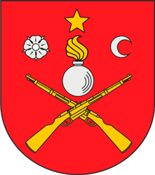 Геральдическое описание герба: В светло-червленом поле над двумя золотыми карабинами, перекрещенными в косой крест дулами кверху, серебряная, зажженная золотом, военная граната, сопровождаемая сверху золотой пятиконечной звездой, серебряной геральдической розой и серебряным же убывающим полумесяцем, в обратном порядке.