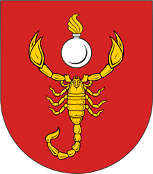 В темно-червленом поле золотой скорпион, сопровождаемый между педипальпами серебряной, зажженной золотом, военной гранатой.