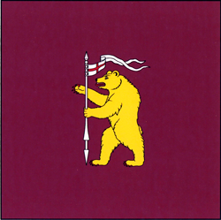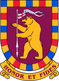 Геральдическое описание герба: В пурпурном поле золотой восстающий медведь с червлеными языком и когтями, атакующий передней правой лапой и несущий в левой серебряное турнирное копье в столб с развевающимся на конце флажком с двумя косицами, серебряным же и обремененным червленым нитяным крестом. Составная кайма лазурево-золото-червлено-золотая. Девиз на золотой ленте пурпурными прописными буквами: "HONOR ЕТ FIDES" ("Честь и преданность").