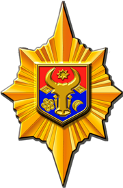 Эмблема Министерства внутренних дел представляет собой восьмилучевую сияющую золотую звезду, на которую наложен червленый круглый медальон, обремененный орлом Министерства внутренних дел (золотой орел с опущенными крыльями, несущий в клюве серебряный крест, в правой лапе такой же меч, в левой – серебряные же фасции, а на груди щит, пересеченный червленью и лазурью, обремененный наложенной золотой головой тура прямо, сопровождаемой между рогами восьмилучевой звездой, внизу справа – геральдической розой и слева – убывающим полумесяцем, также золотыми).