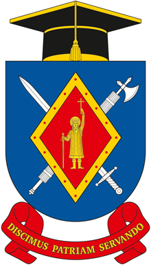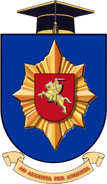 Геральдическое описание герба: В лазуревом поле золотая восьмилучевая звезда с двумя вытянутыми вертикальными лучами. Поверх всего в червленом поле рыцарь в доспехах на восстающем коне, вооруженный поднятой над головой саблей, все золотое. Щит увенчан черной квадратной академической шапочкой с золотой кисточкой. Девиз на золотой ленте червлеными прописными буквами: "AD AUGUSTA PER ANGUSTA" (Через теснины к вершинам).